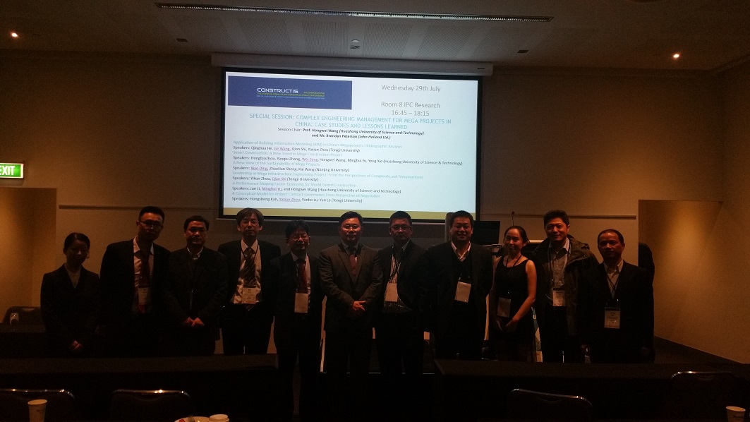 受澳大利亚科廷大学的邀请,2015年7月28日至8月2日,公司总裁何清华教授、建设管理与房地产系施骞教授、博士研究生王歌和硕士研究生周雅娴赴澳大利亚Perth参加了Construct15 (Incorporating the 23rd Global Lean Construction Conference)国际会议,并在重大工程专题会议中分别以中国重大工程BIM应用(Application of Building Information Modeling (BIM) in China’s Megaprojects: Bibliographic Analysis)、重大工程的领导力(Leadership in Mega infrastructure Engineering project: From the Perspective of Compulsory and Temporariness)以及工程合同治理(A Conceptual Model for Project Contract Governance From Perspective of Negotiation)为主题做了专题演讲。