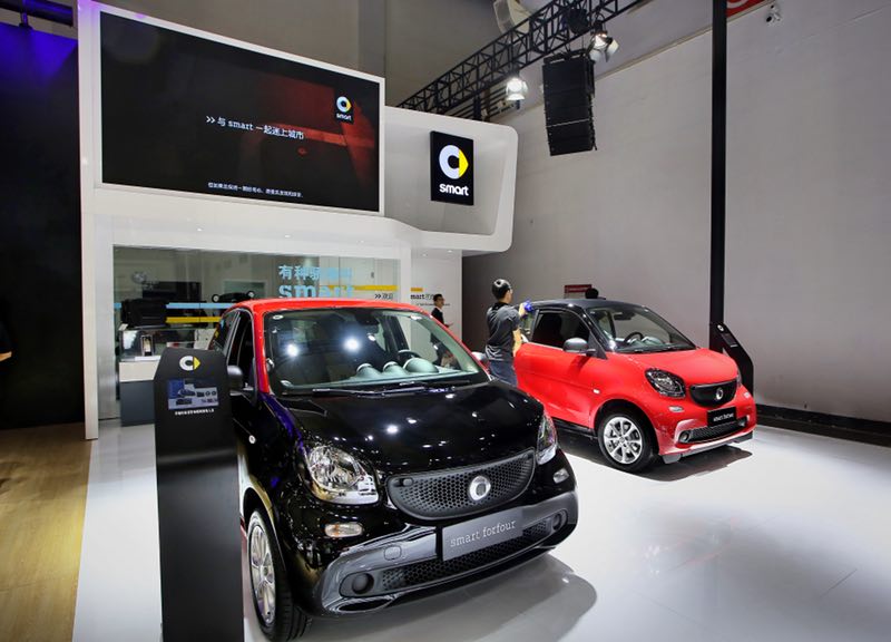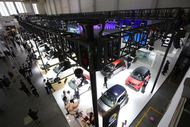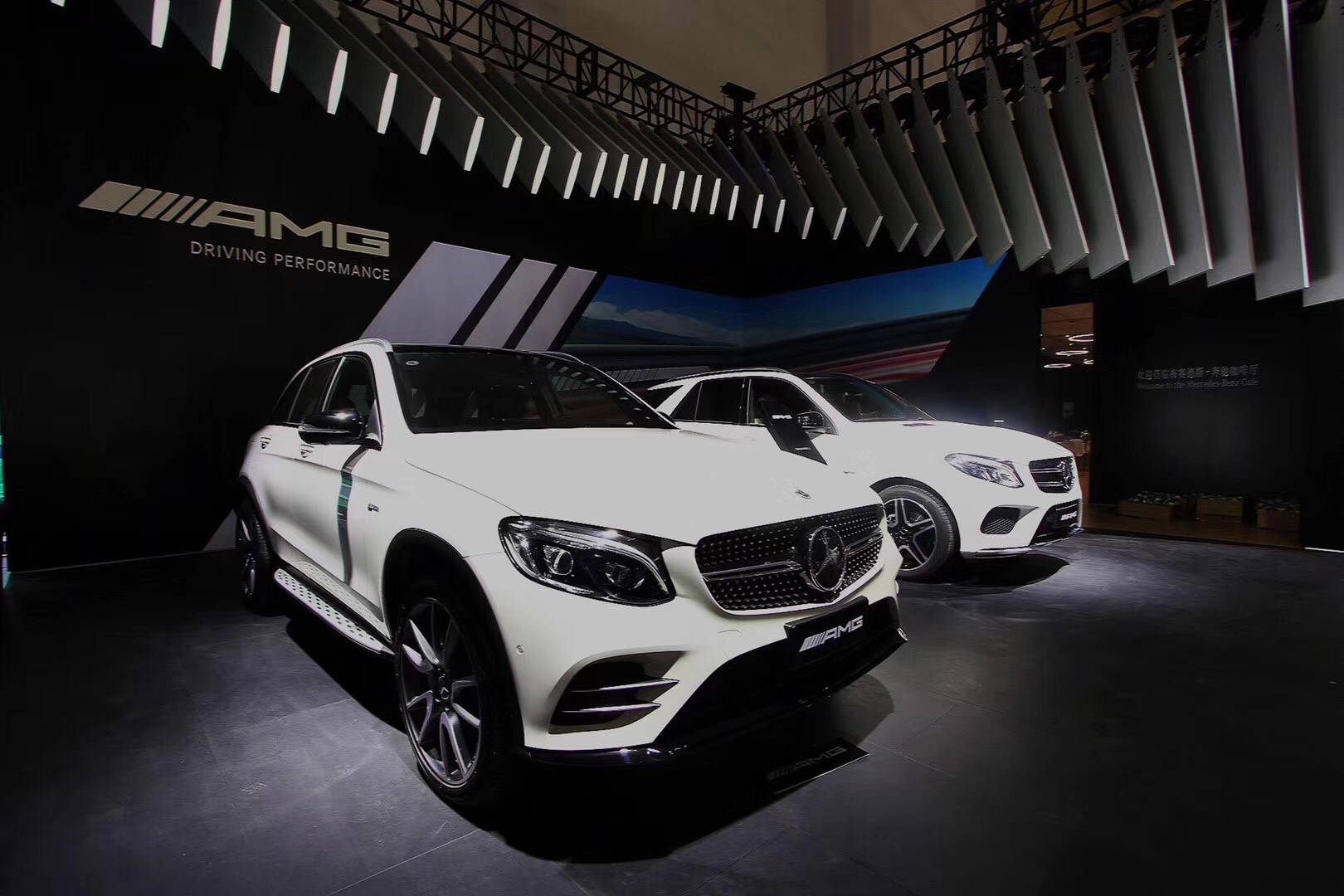 本次车展沿用了奔驰一贯的黑色沉稳主色调墙面,庄重而又内敛,暖色地板又赋予了一丝柔和,与smart区域轻灵的亮白地板水乳交融,相得益彰。