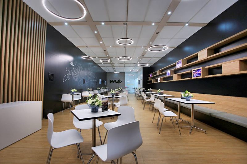 销售室内大大的草绿色“me”字logo,作为整个多元又略带俏皮的商谈室的点睛之笔。