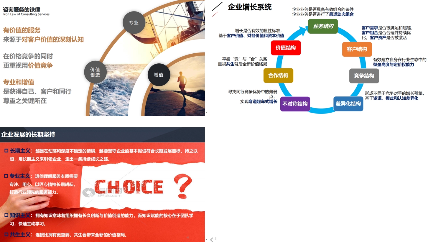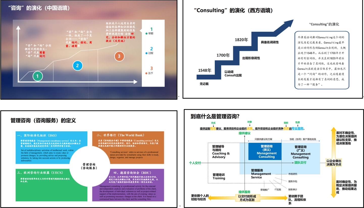 首先,何教授跟同行分享了“咨询”、“CONSULTING”在中国和西方不同语境下的演化过程,管理咨询(咨询)服务在西方世界不同组织的定义以及中国语境和实践当下详细的内涵。