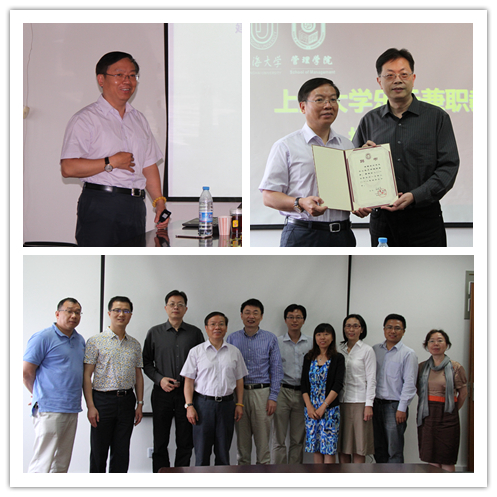2015年6月17日上午,复杂工程管理研究院乐云教授授聘上海大学兼职教授仪式暨上海管理论坛系列讲座在上海大学管理学院420会议室隆重举行。管理学院院长尤建新教授为乐云教授颁发了兼职教授证书,仪式由管理科学与工程系程敏副教授主持。管理学院副院长许学国教授、镇璐教授及管科系师生参加了授证仪式。