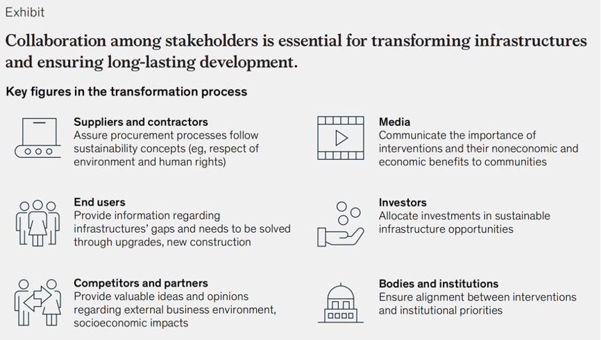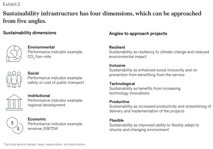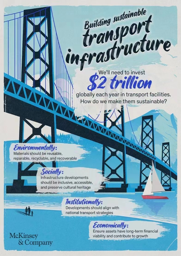 2021年10月,麦肯锡全球研究院(McKinsey Global Institute)发布文章《经久耐用:将可持续作为交通基础设施的优先事项》(Built-to-last: Making sustainability a priority in transport infrastructure)提出了可持续交通基础设施转型的概念框架和路线,包括可持续性的四个维度和优先考虑的五个战略要素,并要求利益相关者合作,在全生命周期各阶段应用可持续发展概念和指标。