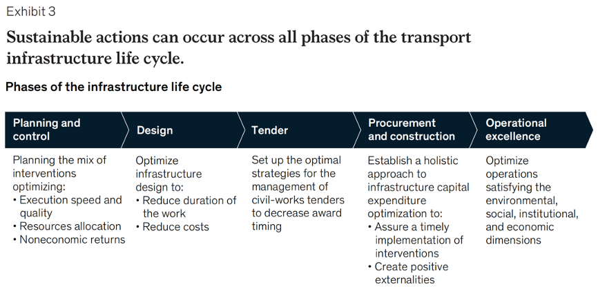可持续性应纳入交通基础设施生命周期的所有五个阶段:规划、设计、招标、采购和施工以及运营。