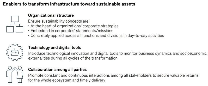 三个关键的推动因素是将基础设施转变为可持续资产的基本因素:组织结构、数字化创新和工具、参与项目的所有利益相关者之间的联合方法和协同。