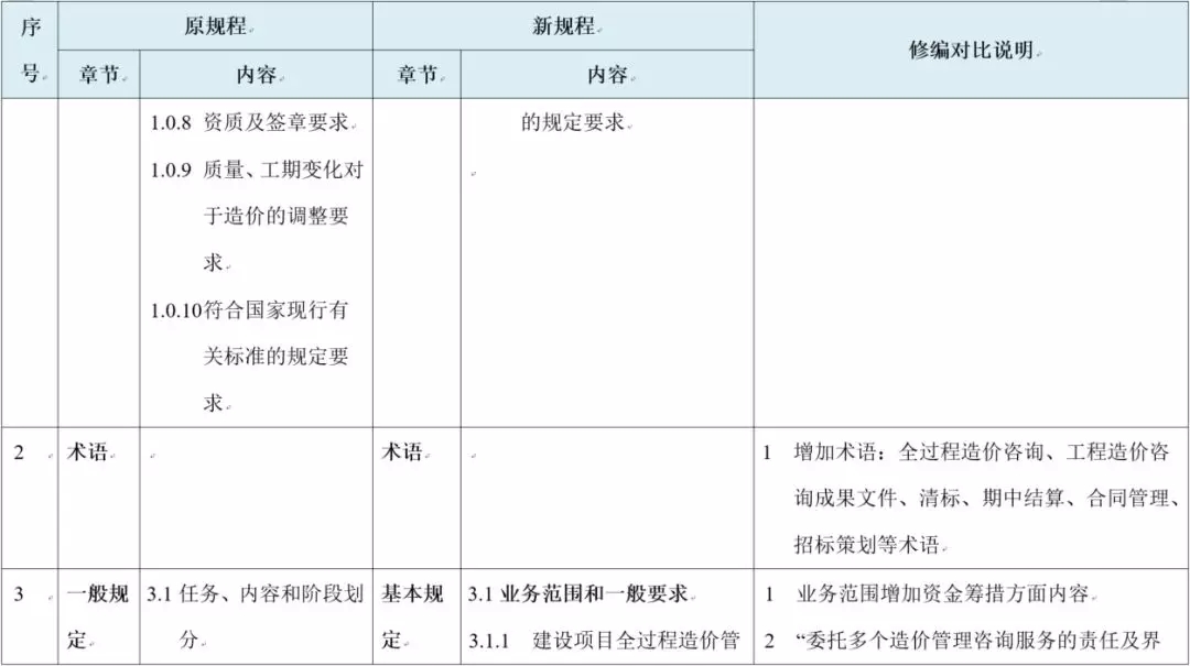 修订后的《建设项目全过程造价咨询规程》包含总则、术语、基本规定、决策阶段、设计阶段、发承包阶段、实施阶段、竣工阶段、附表及条文说明章节,与原规程对比如下: