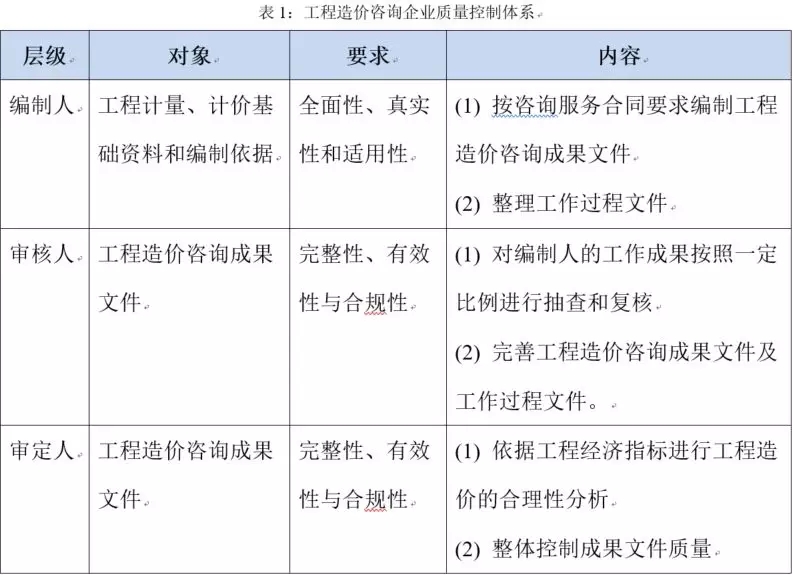 �解读:工程造价咨询企业应按照《建设工程造价咨询规范》(GB/T 51095-2015),结合企业的管理模式、咨询业务的特点,建立起三级管理、二级校核的质量管理体系,并通过加强流程控制、企业标准等措施来确保工程造价咨询质量,如表1所列。