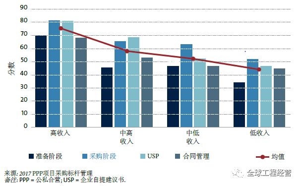 2017年PPP采购标杆管理将对涵盖PPP项目周期主要阶段的四个领域的进行分析:PPP的准备阶段,采购阶段和合同管理以及企业自提建议书(USPs)的管理。通过大量广泛搜集PPP交易的数据,由专家对每个地区的各项PPP管理绩效进行评分,平均绩效因地区和收入水平而异。图1显示,收入水平越高的组,四个领域的绩效越高。数据还显示,亚太经济合作与发展组织(经合组织)的高收入地区和拉丁美洲和加勒比地区的平均水平达到或高于平均水平。