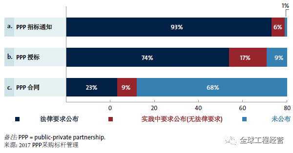 信息披露方面的做法仍有较大的改进空间。一个透明的竞争过程对于提高项目的产出和基础设施的运营效率至关重要。透明的过程需要公开提供并确保项目竞争性相关的所有信息。大多数经济体进行招标公告(93%)和PPP的公告(74%),只有23%的经济体发布了PPP合同,而且很少在网上公布。
